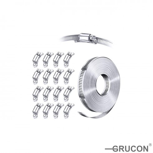 Set de cinta de abrazadera tipo cremallera no perforada más cerraduras. Perfectas para armar las abrazaderas a su medida, especialmente para diámetros grandes mayores a 5".